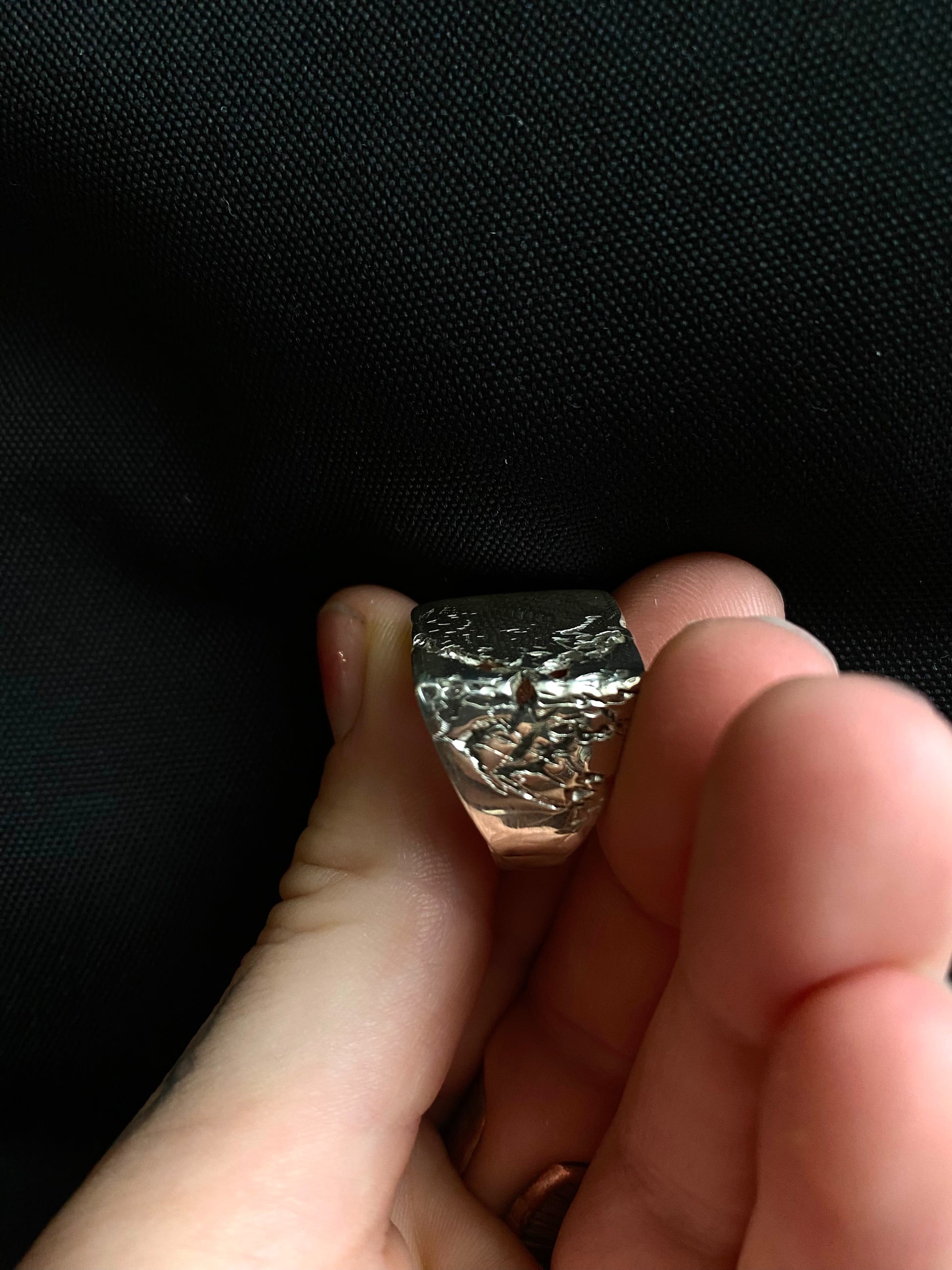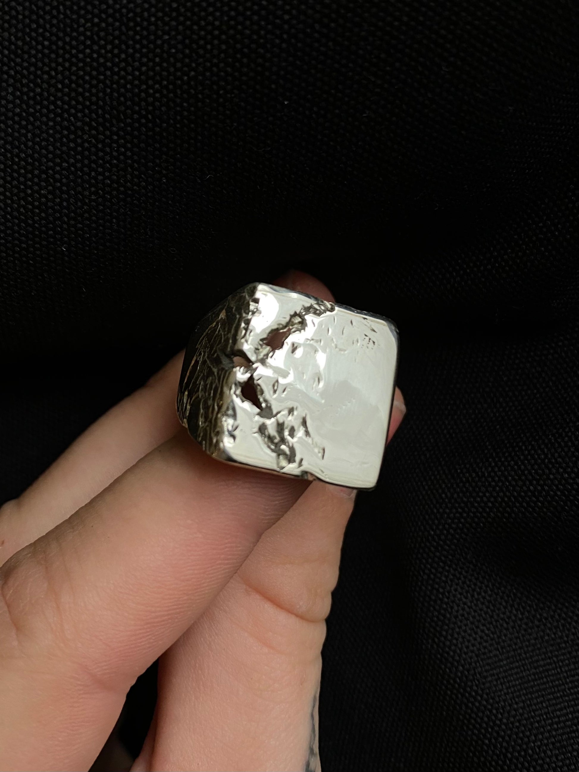 Cette chevalière en argent 925 est une création unique signée Fraiz, entièrement façonnée à la main. Issue d’une collection de bijouterie artisanale, elle pèse environ 7,8 grammes et arbore une petite fissure qui lui donne tout son caractère.